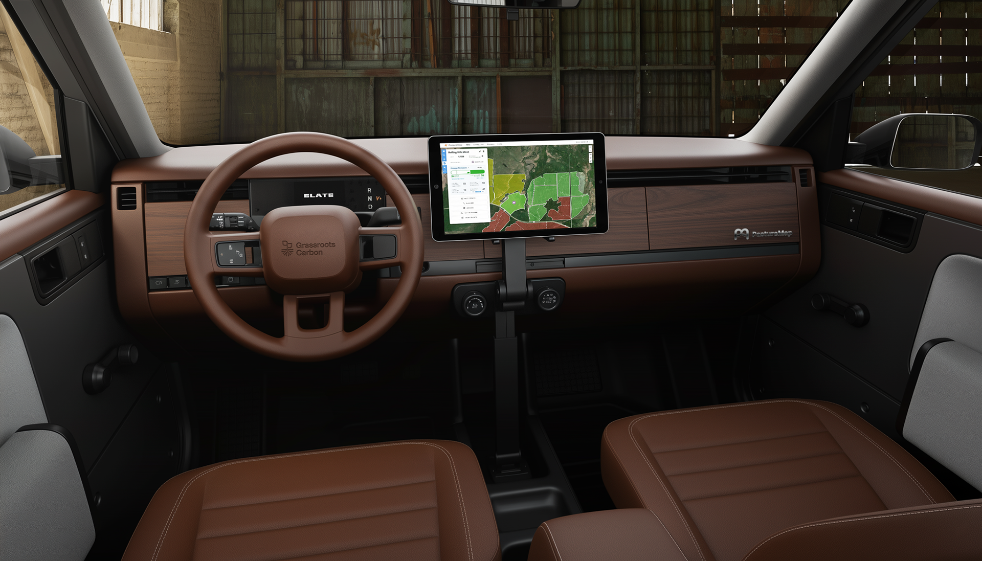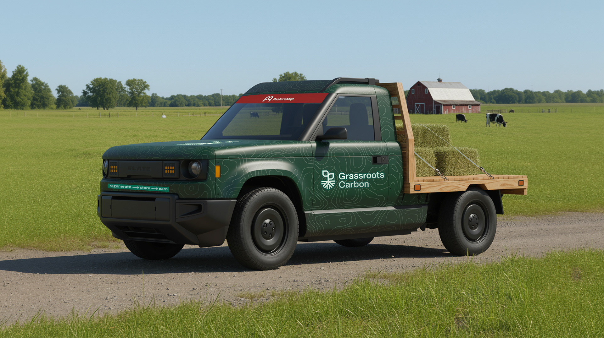The second path imagines an OEM collaboration, where PastureMap is natively integrated into a special edition SLATE EV pickup, modified for light duty around the farm. This mini-twist on the classic work truck doesn't just turn heads & bails, it could showcase how ranchers can access to real-time grazing data directly from the driver’s seat. The result is more than a demo vehicle; it’s a mobile platform for product development, brand storytelling, customer acquisition, and ultimate alignment at the intersection of climate, tech and mobility.