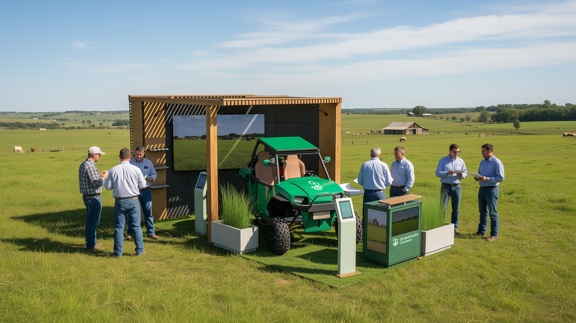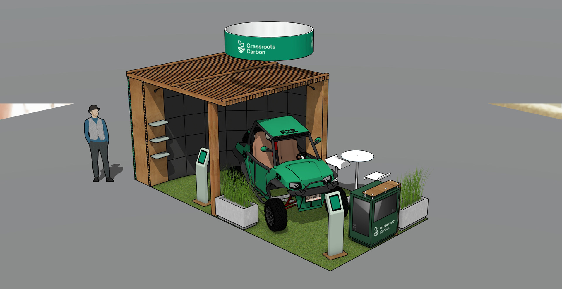 For Grassroots Carbon’s 10x20 booth concept, the approach combined a flexible beMatrix frame system with integrated LEDskin panels or a curved LED wall to create an eye-catching digital presence. The structure was grounded in a “real world” aesthetic, layering natural wood accents, a turf floor, and environmental treatments to echo open pasture and land stewardship. To amplify the experiential feel, the booth includes customizable, readily available elements ike a Polaris RZR, anchoring the space in authenticity while keeping production practical, replicable, and brand-aligned.
